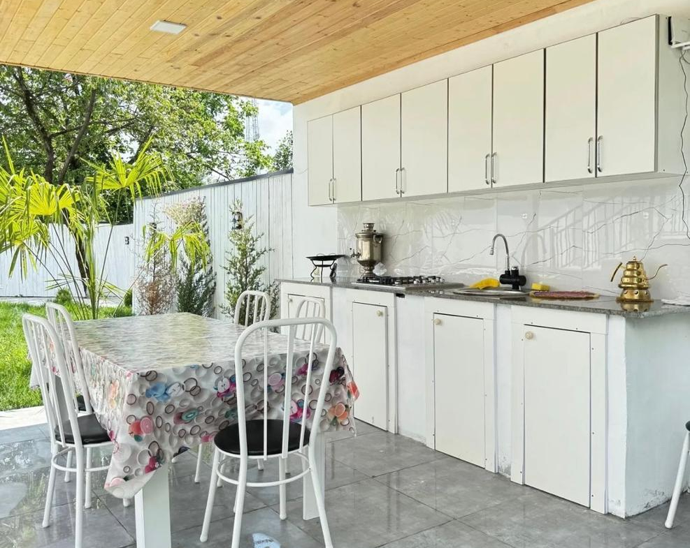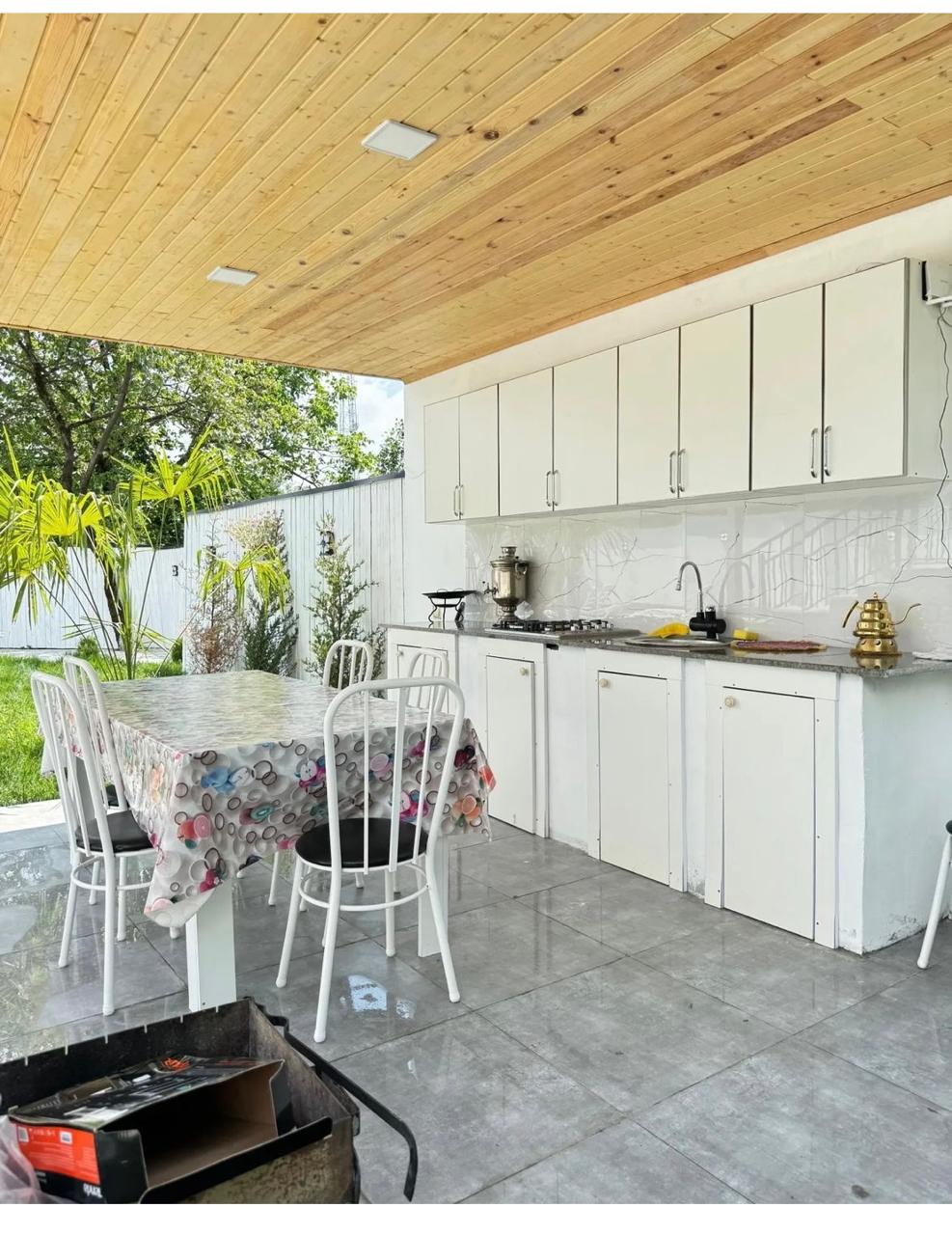 Həyətdə yay mətbəxi və oturma zonası yerləşir.